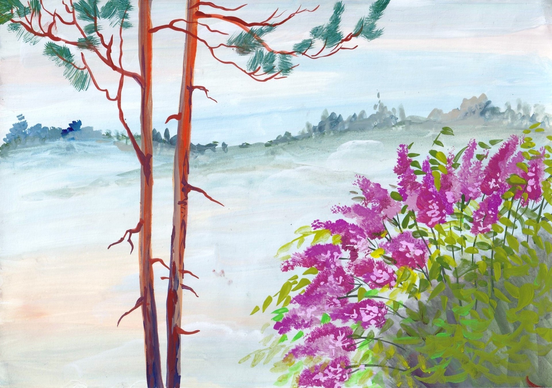3 урок. "Летний туман". Научимся писать глубину на картине, передний план с цветущим кустом и сосной.